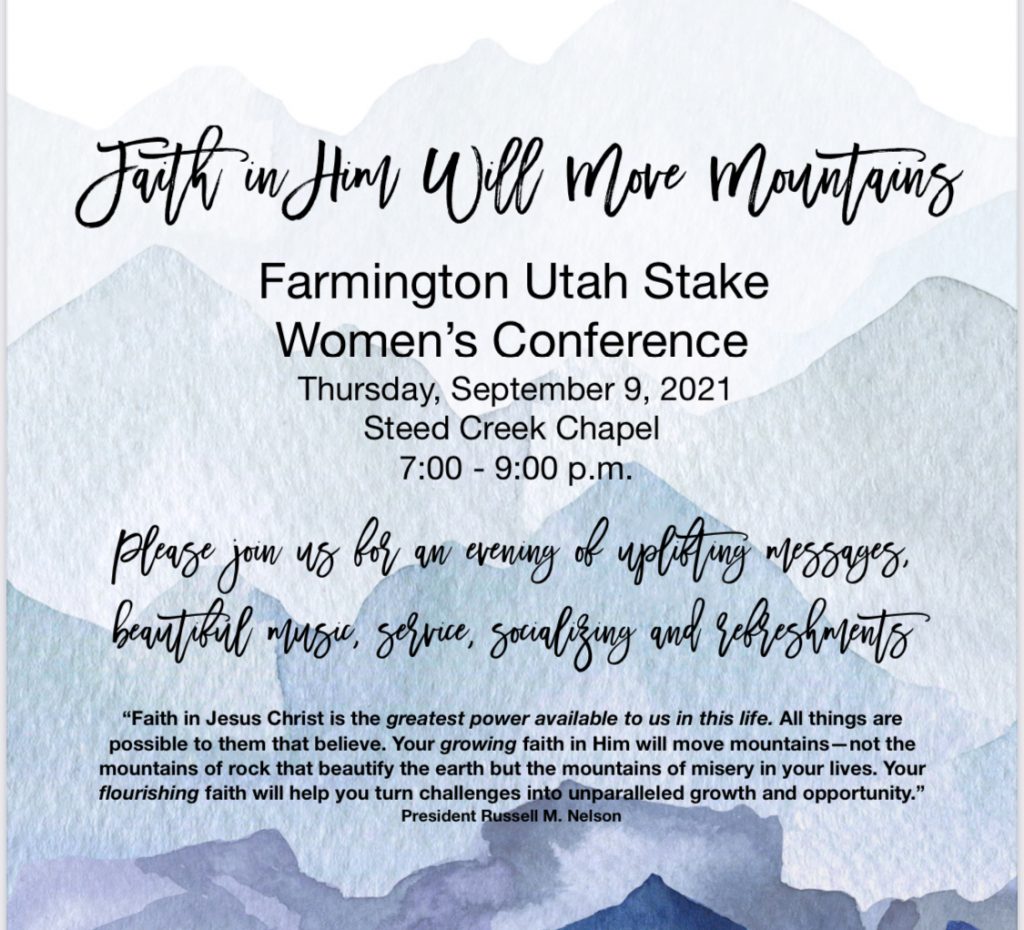The theme for this conference, “Faith in Him Will Move Mountains” comes from President Russell M. Nelson’s most recent conference talk, “Christ Is Risen; Faith in Him Will Move Mountains.” https://www.churchofjesuschrist.org/study/general-conference/2021/04/49nelson?lang=eng . We hope you have had an opportunity to study his message and set some personal goals in the five areas he suggests to help us develop and increase our faith and trust in our Savior Jesus Christ. We encourage you to reflect on how his message has helped you and invite you to share how your efforts to increase your faith are blessing your life. We would also love to hear what part of his message stood out to you and why. We read in Luke 22:31-32, “And the Lord said, Simon, Simon, behold, Satan hath desired to have you, that he may sift you as wheat: but I have prayed for thee, that thy faith fail not: and when thou art converted, strengthen thy brethren.” We know that our testimonies and faith grow by acknowledging the blessings, even miracles, that come from the Lord in our efforts to increase our faith and that our shared experiences can strengthen and lift each other. Please accept our invitation to share your thoughts and experiences by emailing them to jewal.caldwell@gmail.com by next Sunday, September 5th.