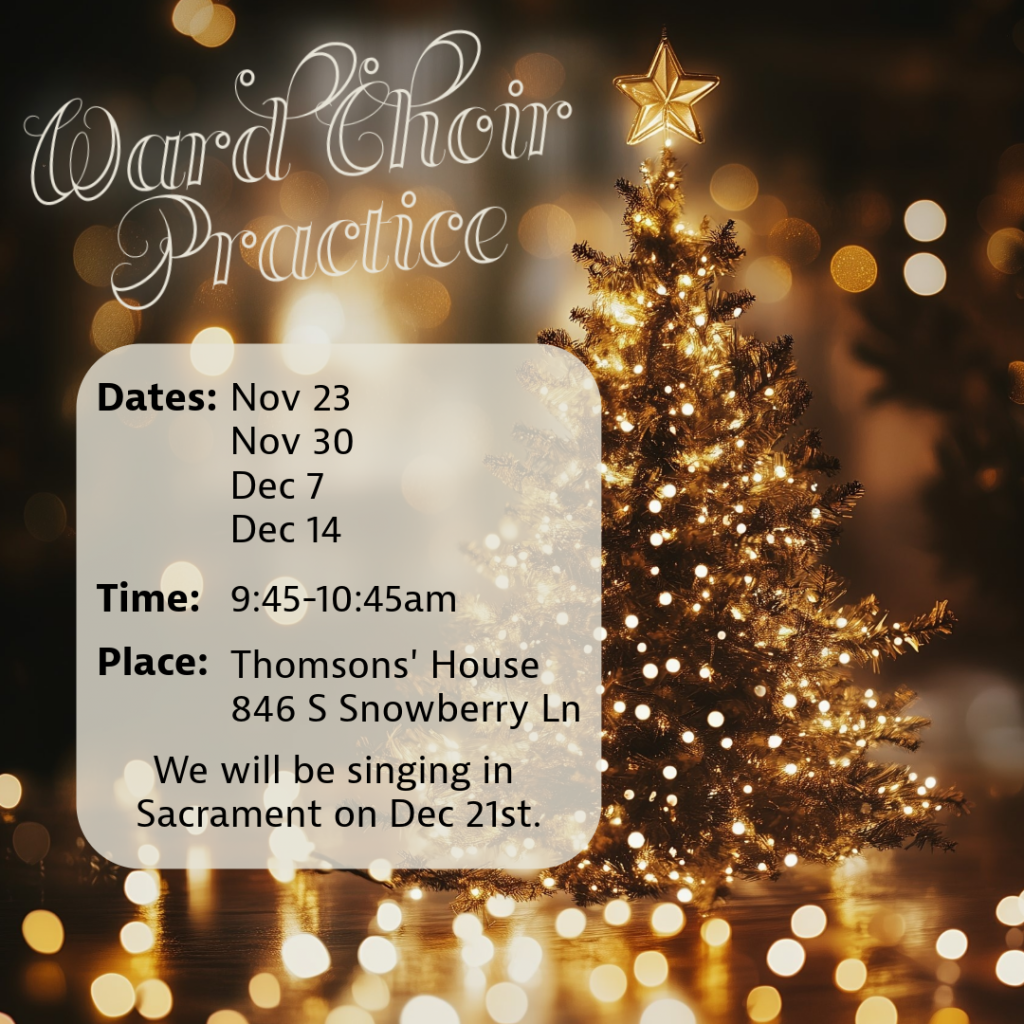 | Ward Choir Practice | Nov 23, 30, Dec 7, 14 9:45-10:45am Thomsons’ house | Please come sing! |
